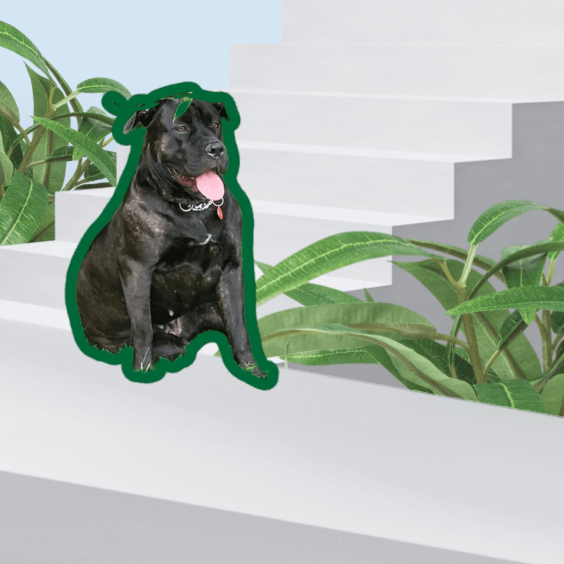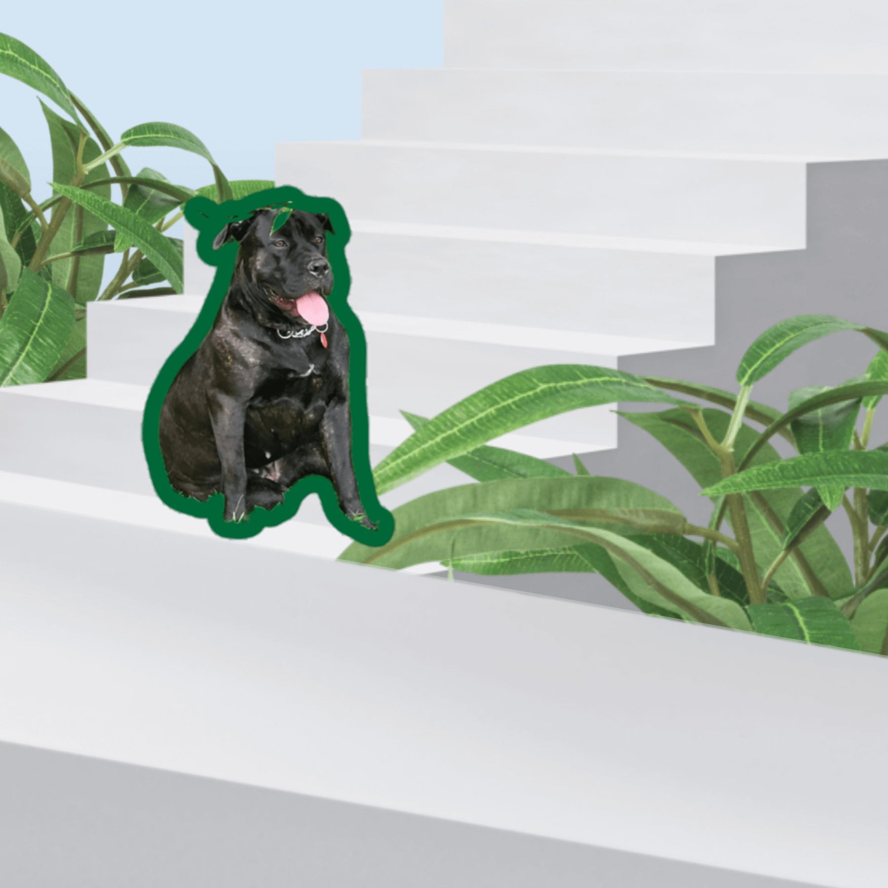 Spring Time Good Girl sticker featuring a black dog sitting on white stairs among green plants.